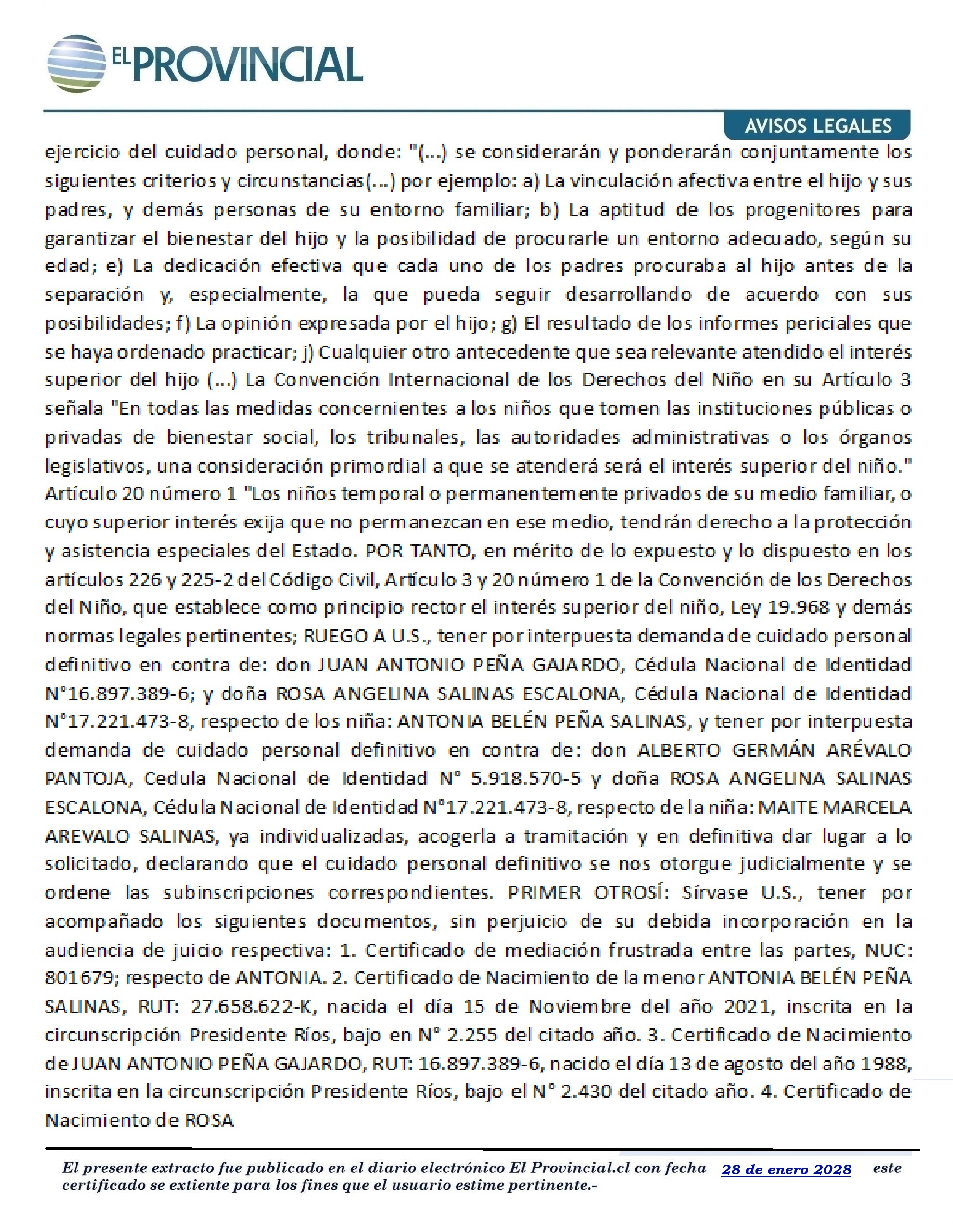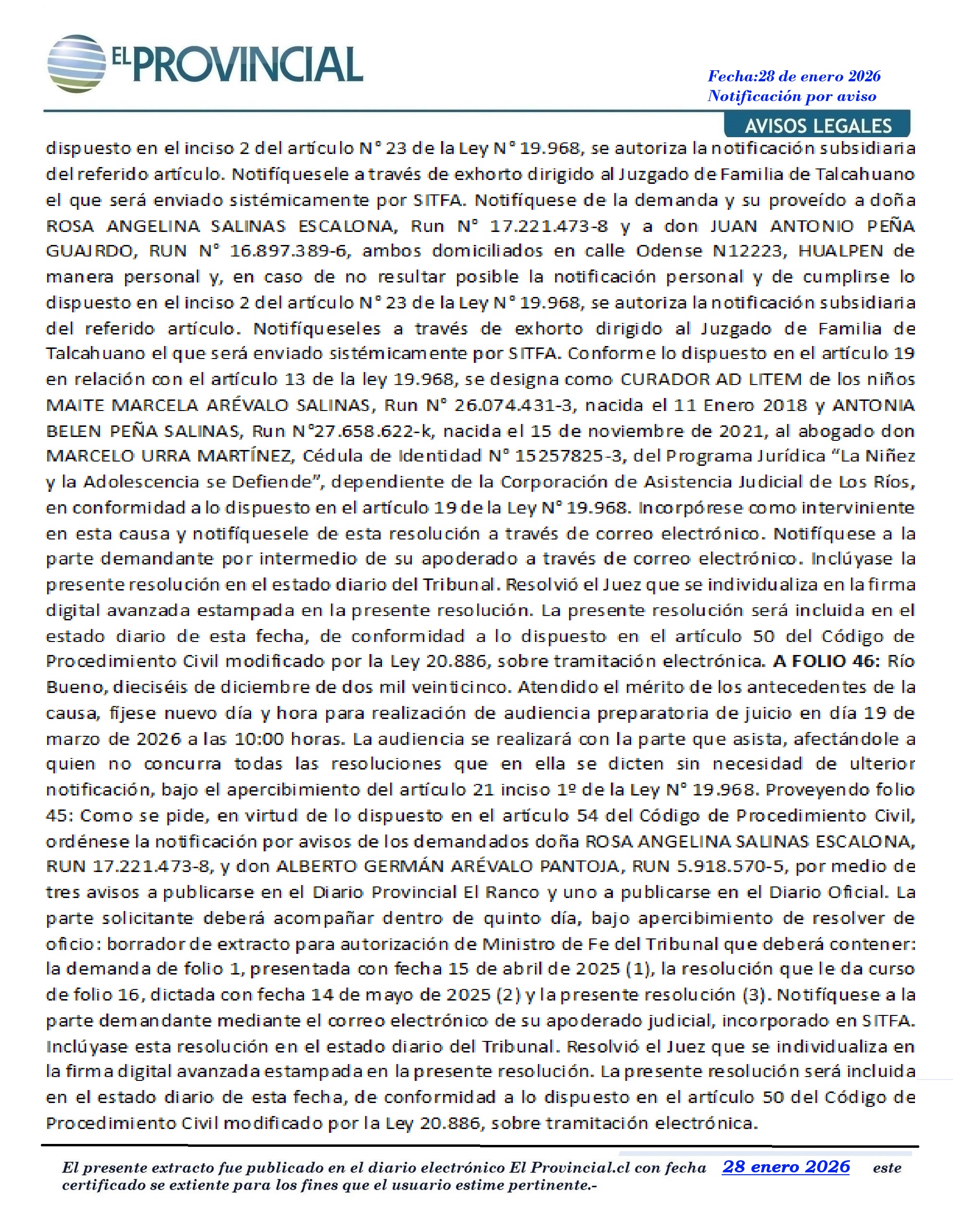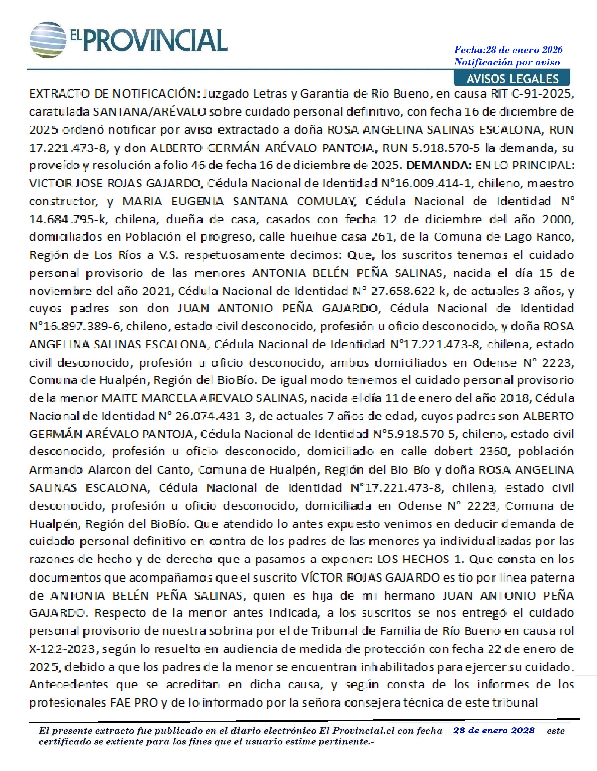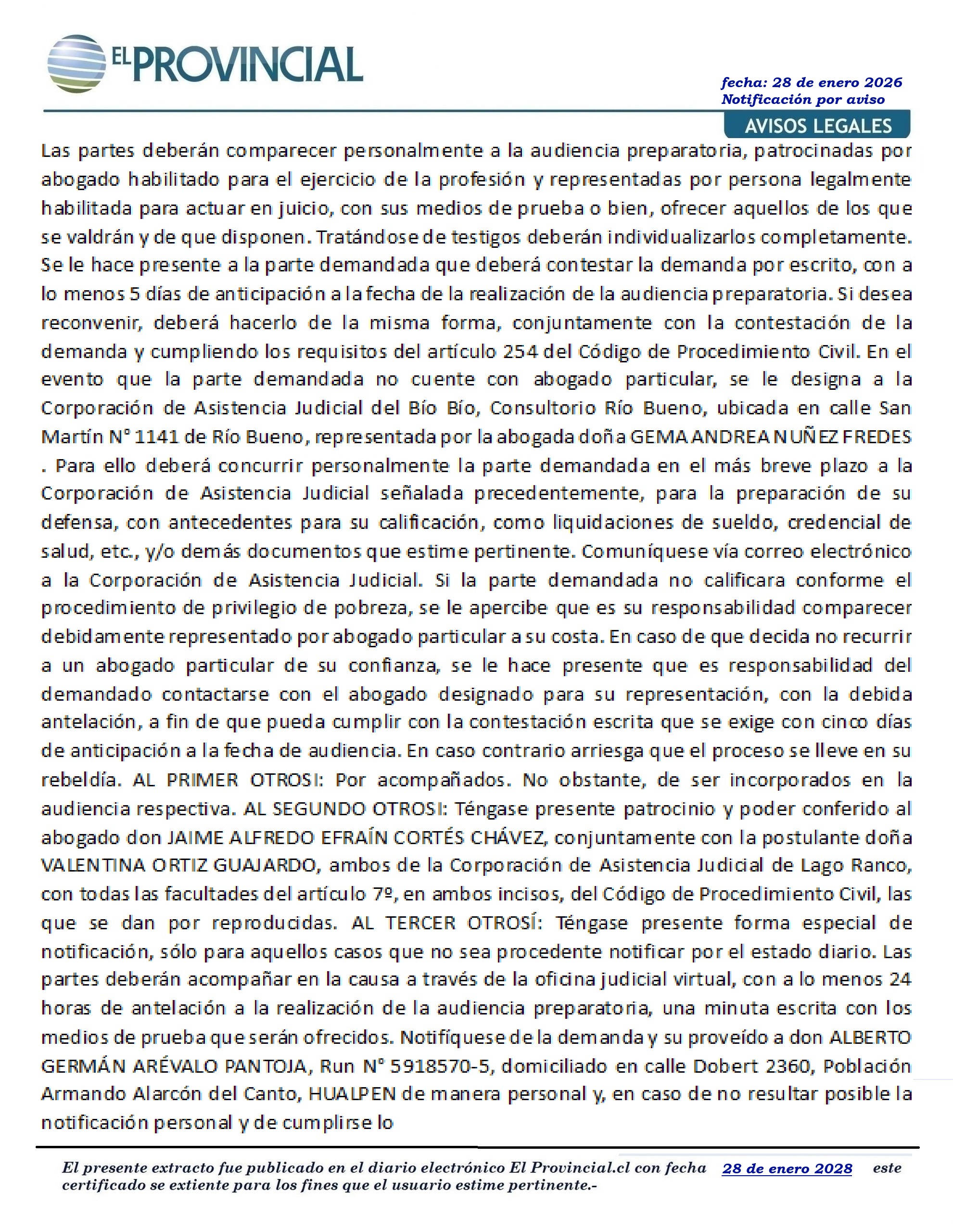 EXTRACTO DE NOTIFICACIÓN: Juzgado Letras y Garantía de Río Bueno «SANTANA/ARÉVALO»