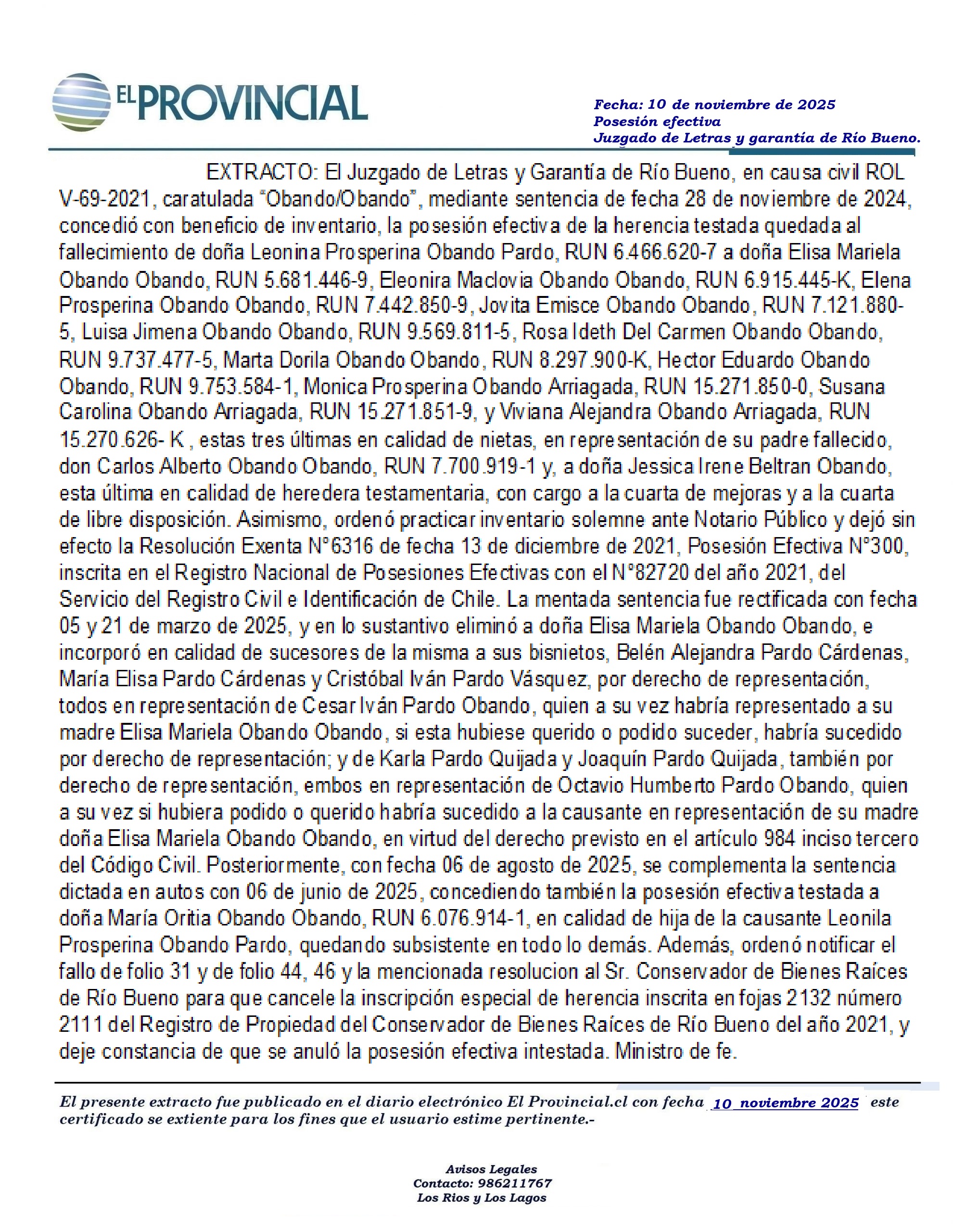 EXTRACTO: El Juzgado de Letras y Garantía de Río Bueno, Posesión efectiva “Obando/Obando”.