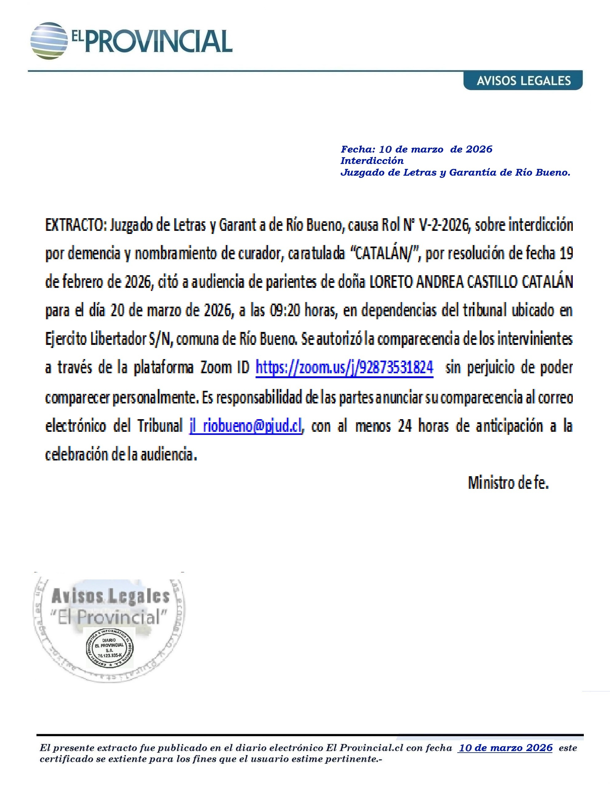 Extracto: Juzgado de Letras y Garantía de Río Bueno- interdicción “CATALAN».-