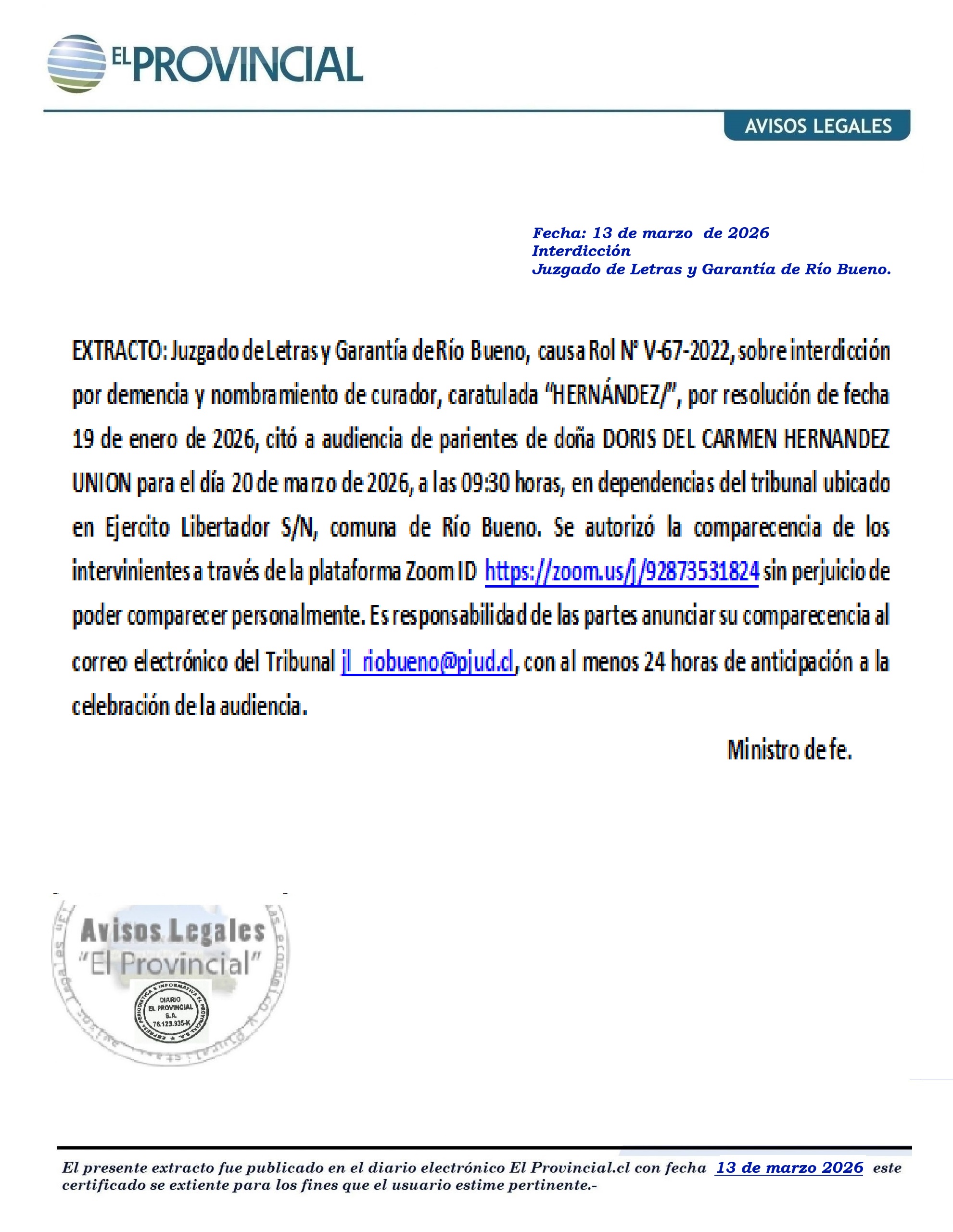 Extracto: Juzgado de Letras y Garantía de Río Bueno- interdicción “HERNÁNDEZ».-