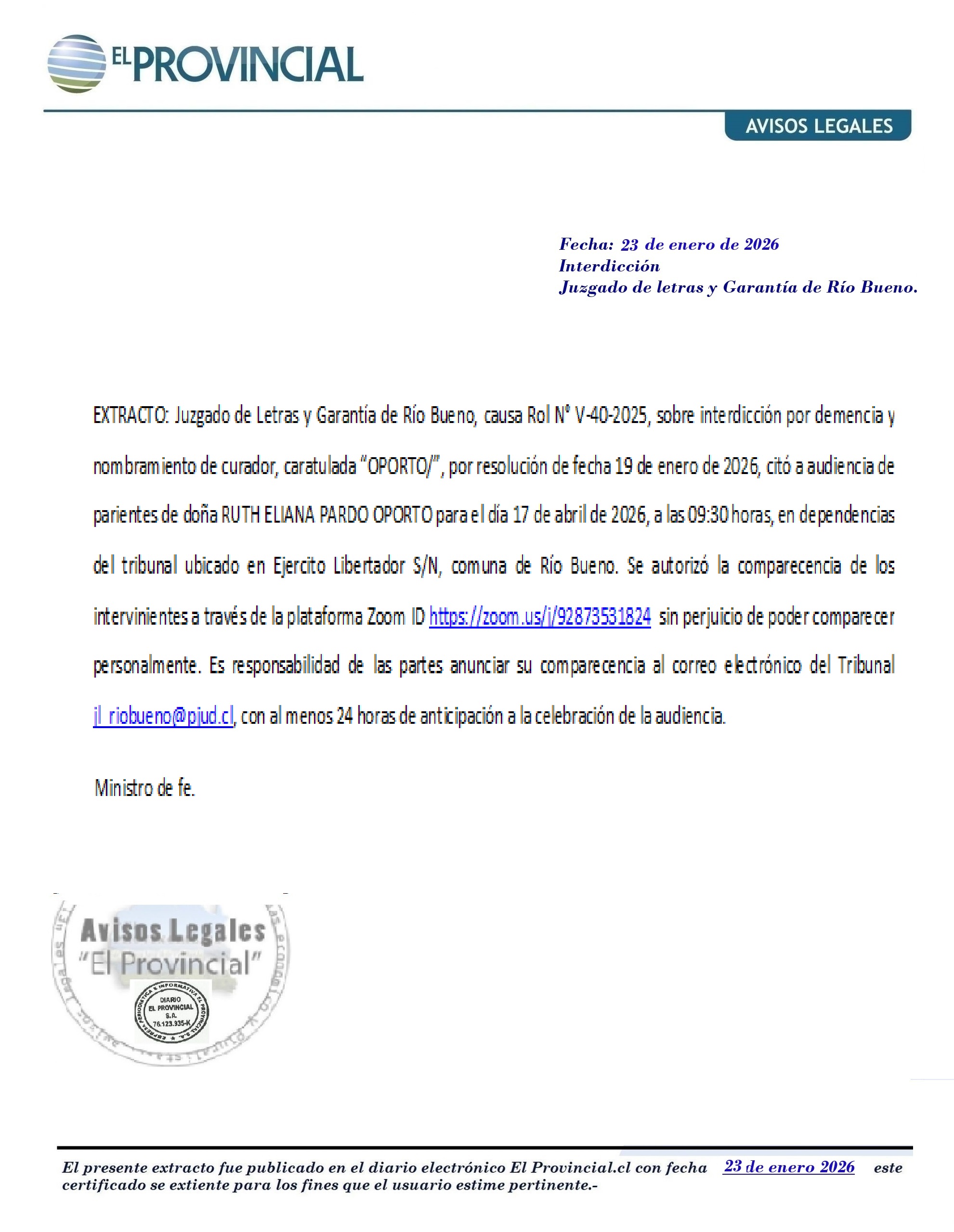 Extracto: Juzgado de Letras y Garantía de Río Bueno- interdicción “OPORTO”.